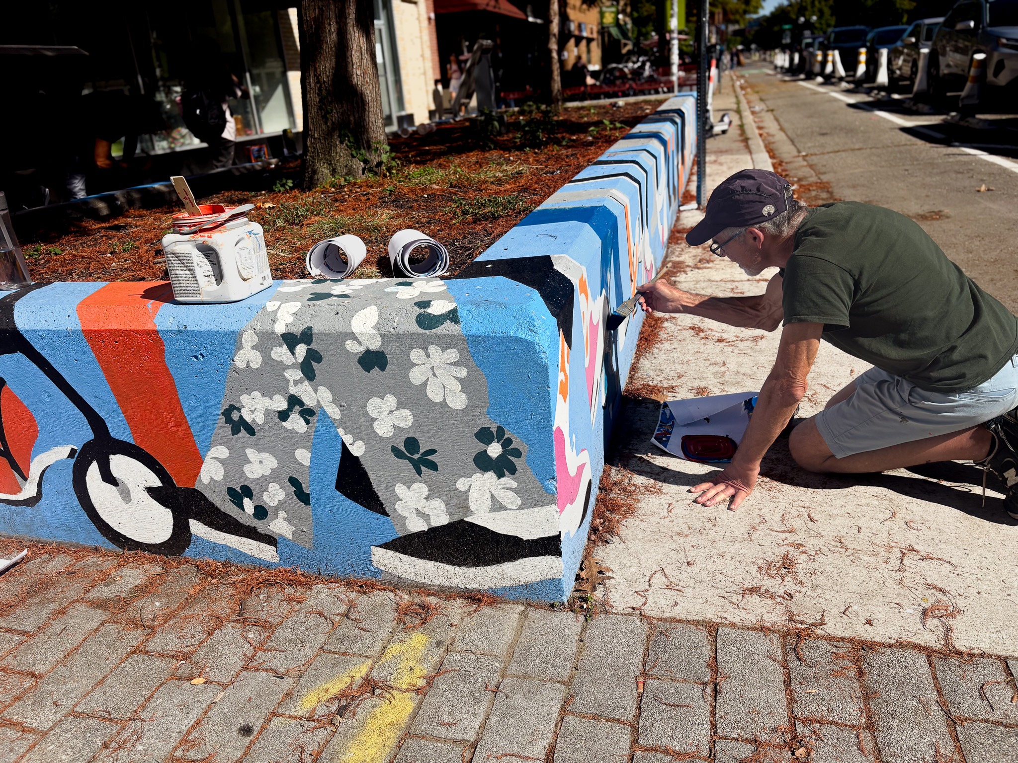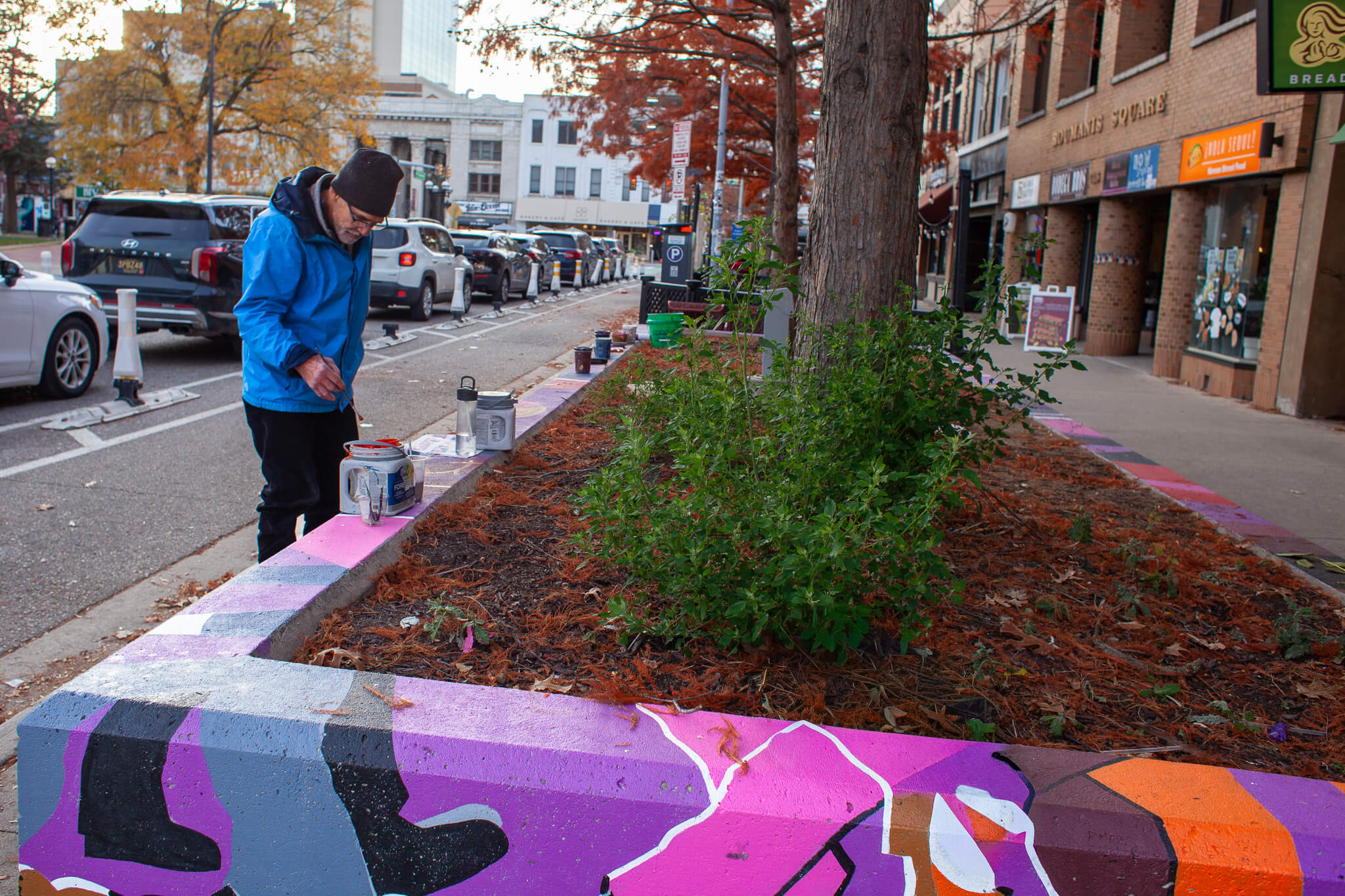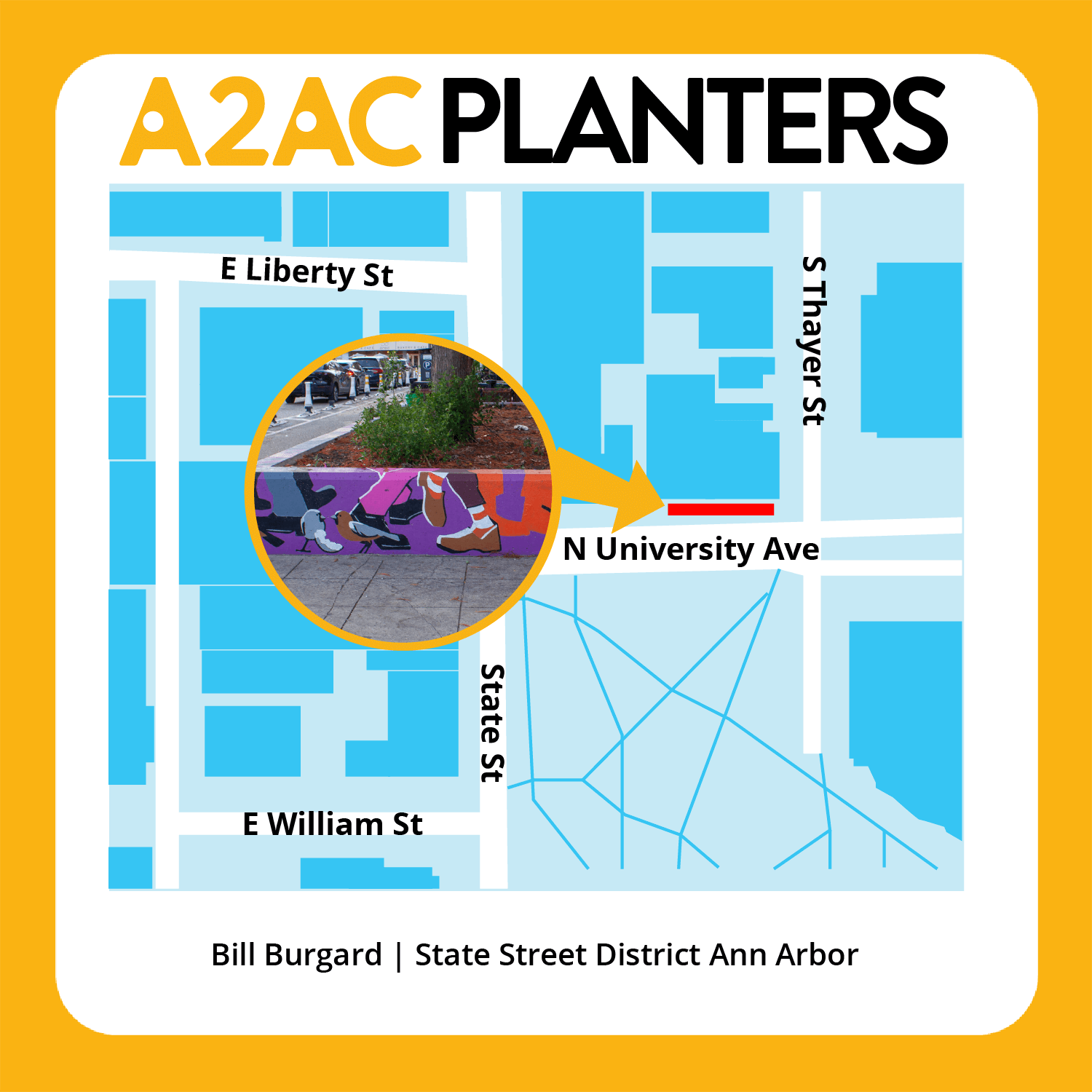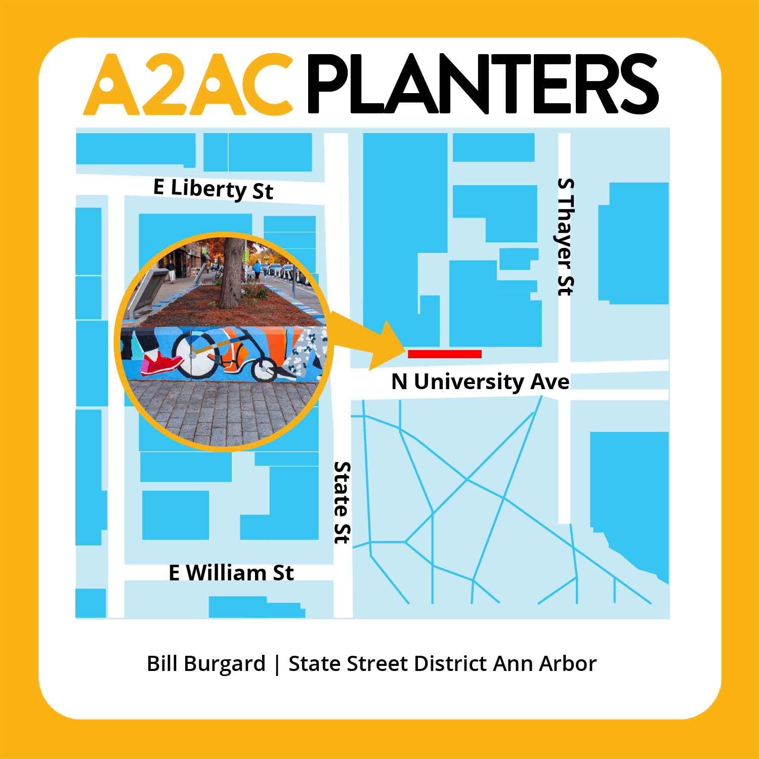 The A2AC Murals and Planters project has helped turn walls and sidewalks across Ann Arbor into bright, welcoming spaces filled with local art. Led by the Ann Arbor Art Center through its Art in Public initiative, the program has supported large-scale murals and hand-painted planters throughout downtown and surrounding neighborhoods. These works showcase a wide range of artistic styles and voices while bringing color, creativity, and energy to everyday places where people live, shop, and gather. By partnering with local businesses, property owners, and community members, A2AC Murals and Planters strengthens Ann Arbor’s identity as a city that values public art and makes creativity visible and accessible to all. The 2025 planter installations recognized through the Golden Paintbrush Award were created by local artists Bill Burgard and Rick Malt.