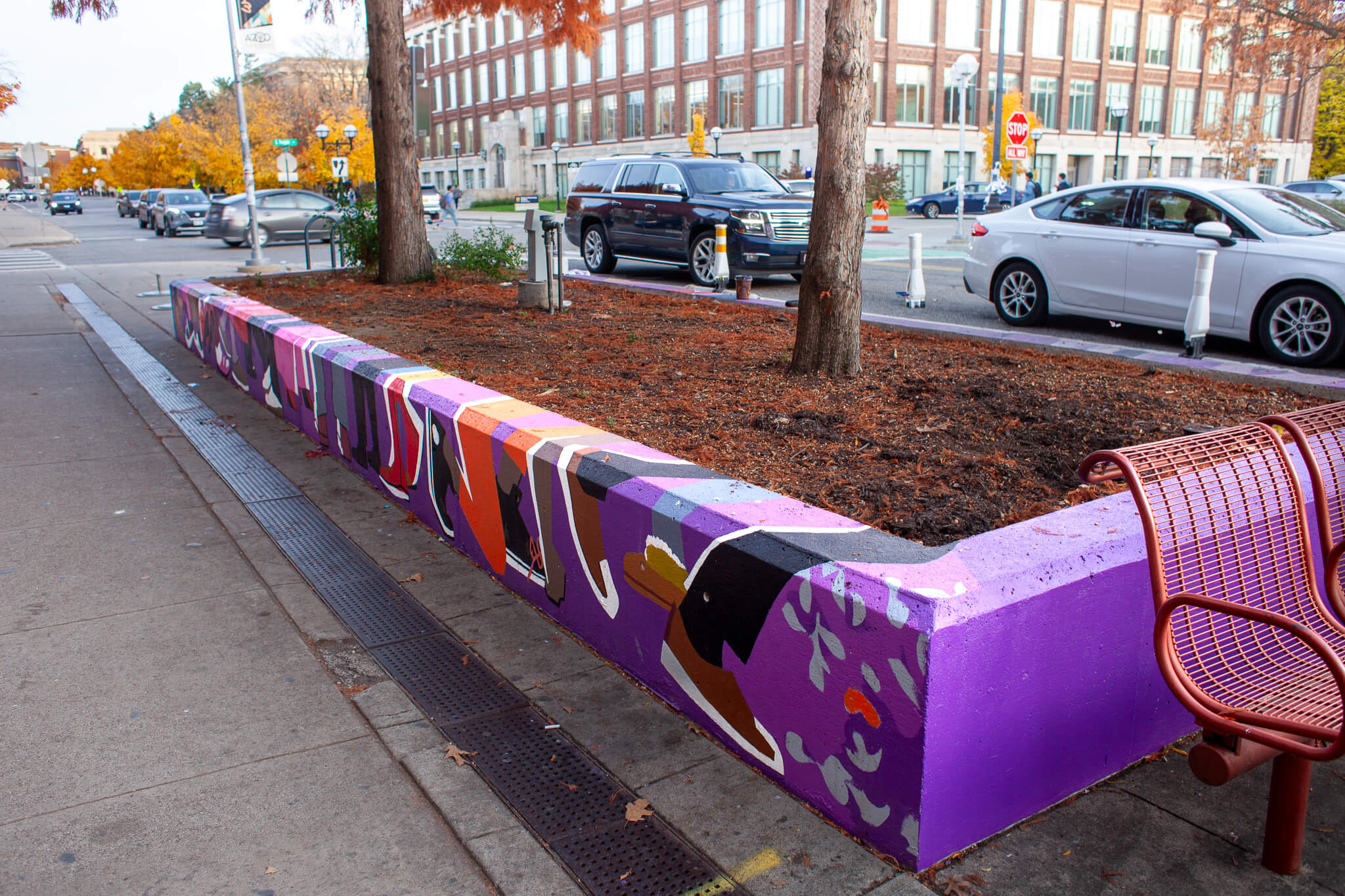 "The mural on the planters amplifies the number of people that walk through the space every day. The images project the attitude and diversity of the foot traffic in a playful way that I think brings an exciting addition to this vibrant space."