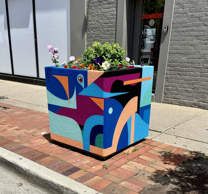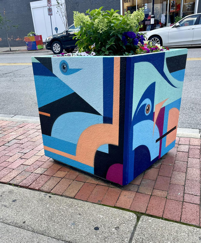 The A2AC Murals and Planters project has helped turn walls and sidewalks across Ann Arbor into bright, welcoming spaces filled with local art. Led by the Ann Arbor Art Center through its Art in Public initiative, the program has supported large-scale murals and hand-painted planters throughout downtown and surrounding neighborhoods. These works showcase a wide range of artistic styles and voices while bringing color, creativity, and energy to everyday places where people live, shop, and gather. By partnering with local businesses, property owners, and community members, A2AC Murals and Planters strengthens Ann Arbor’s identity as a city that values public art and makes creativity visible and accessible to all. The 2025 planter installations recognized through the Golden Paintbrush Award were created by local artists Bill Burgard and Rick Malt.