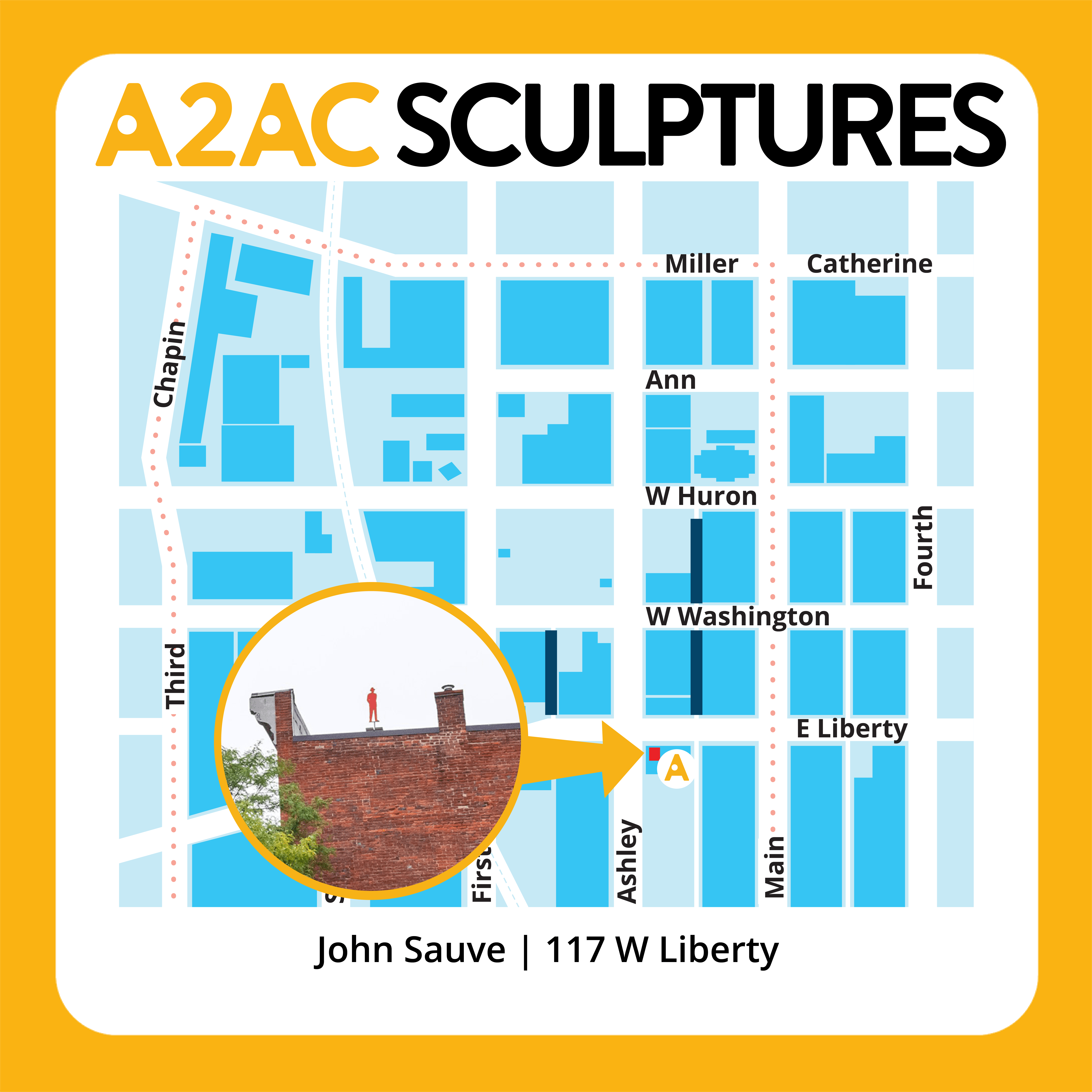 The Man in the City International Sculpture Project is comprised of over 100 sculptures located on rooftops throughout Detroit, Windsor, Benton Harbor, New York, and now Ann Arbor!