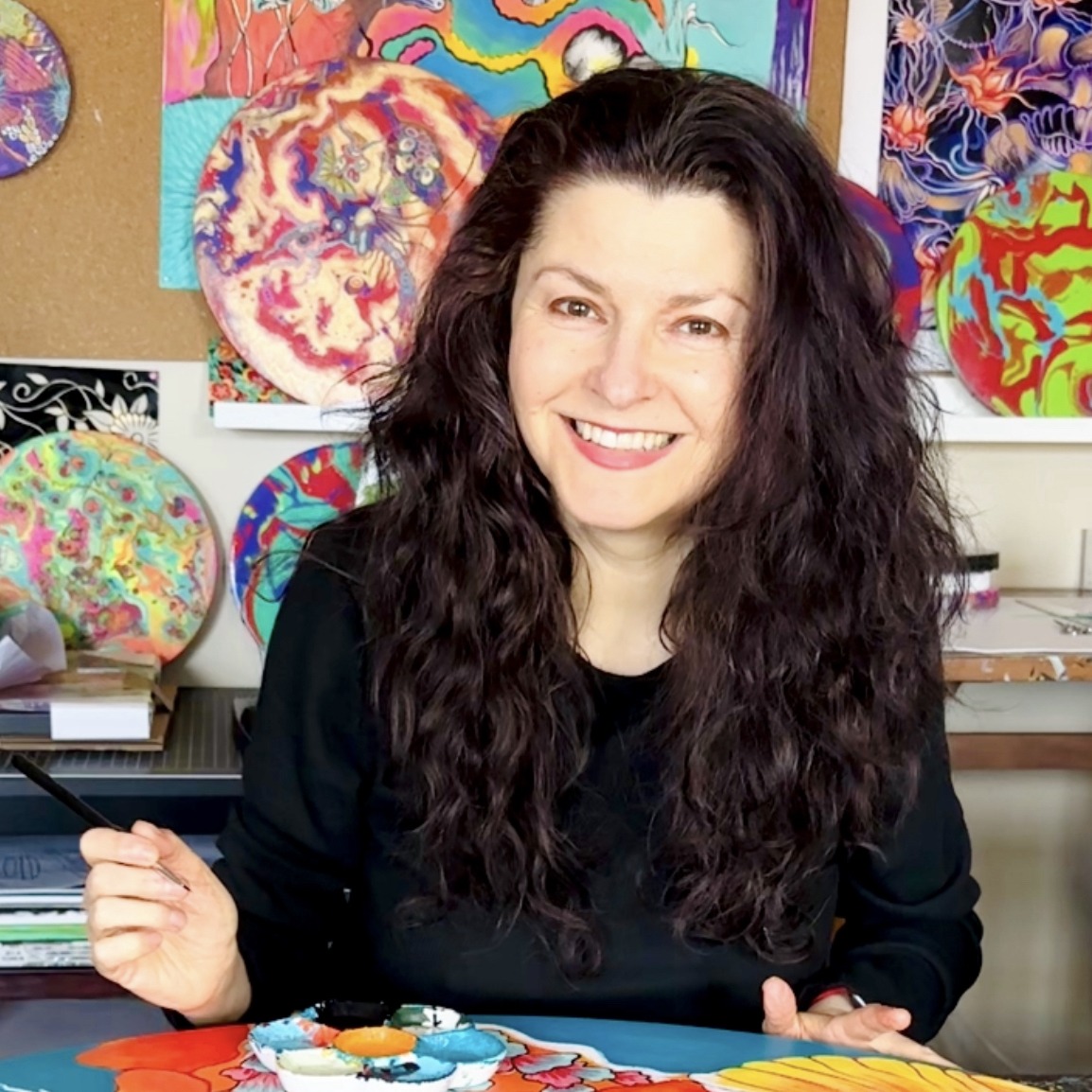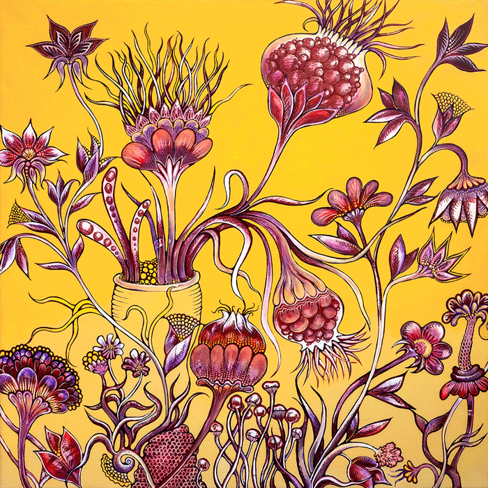 Hava Gurevich’s work is a celebration of the hidden magic woven through the natural world. Intricate networks of mushrooms, flowers, bees, coral, and imagined life forms that remind us how deeply everything is connected. In Organic Fiction, Gurevich explores these relationships through colorful abstractions inspired by botany, marine life, and microscopic worlds.