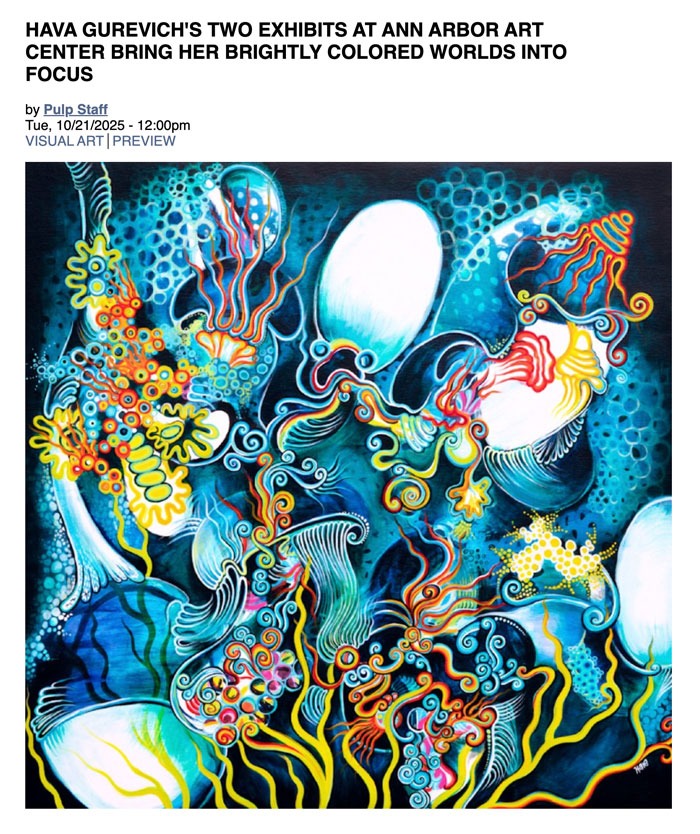 Hava Gurevich’s two exhibits at Ann Arbor Art Center bring her brightly colored worlds into focus