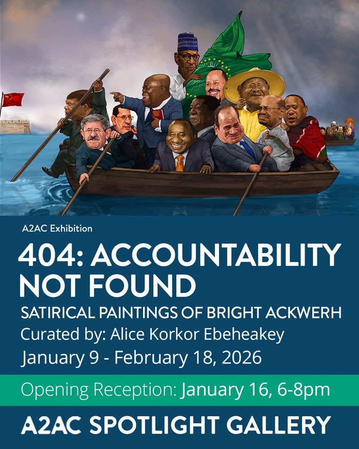 "Since the upsurge of the World Wide Web more than two decades ago, those searching the internet have occasionally encountered the message, “404: Page Not Found.” This visual notification often stirs frustration and disappointment. The exhibition title replaces “Page Not Found” with “Accountability Not Found,” taking a cue from this sentiment of frustration and disappointment to situate itself within the context of artistic social commentary. Through the satirical paintings of Bright Ackwerh, this exhibition offers insight into lived experiences in contemporary Africa and visual representation of a singular yet collective response to these experiences. The exhibition explores how art can confront the global challenge of holding elected officials accountable for their actions. At its core, 404: ACCOUNTABILITY NOT FOUND examines the exploitative dynamics between the Global North and the Global South, particularly the onerous conditionalities attached to aid. The works highlight how colonial legacies persist in modern forms of hegemony.